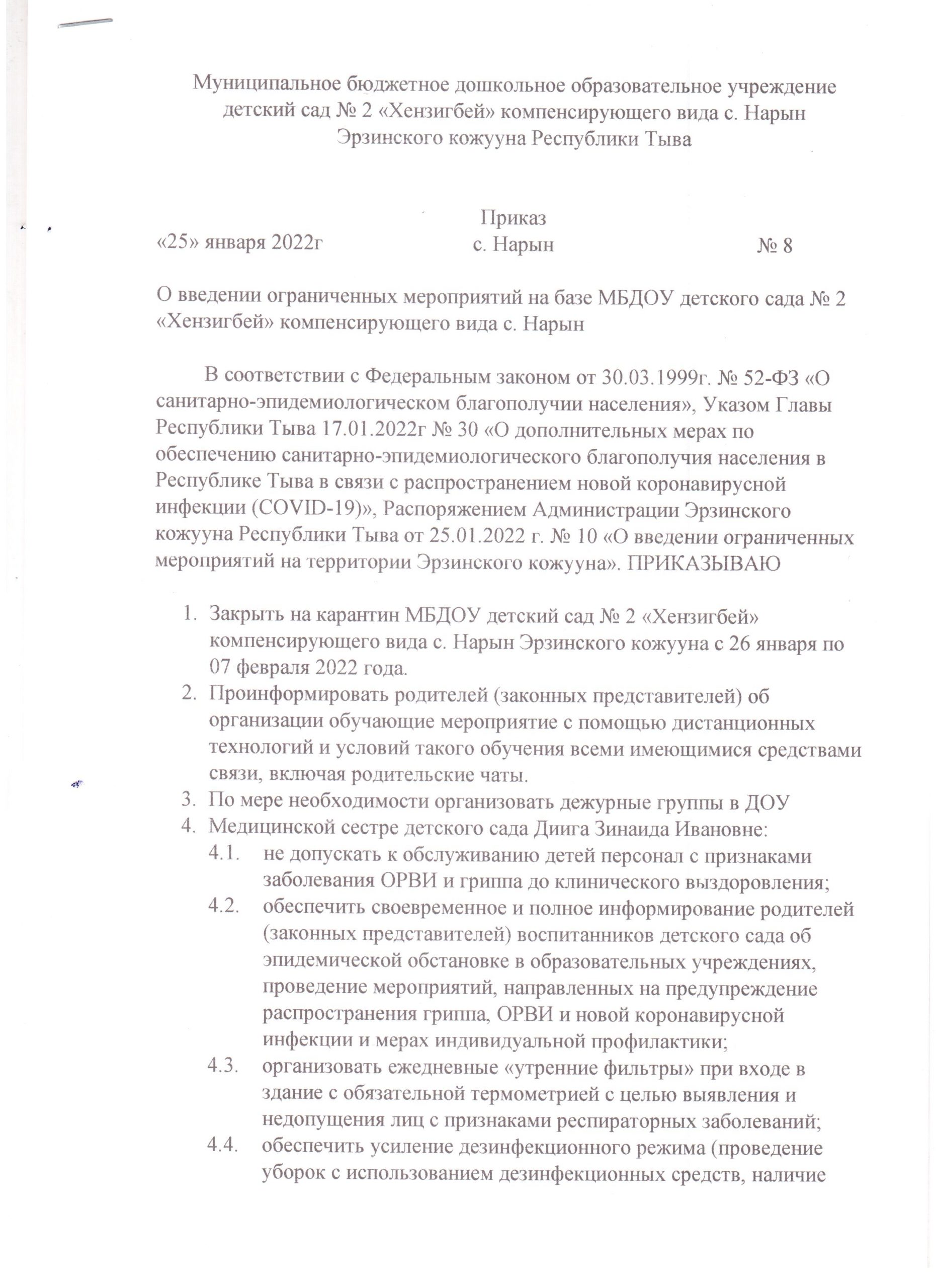 Организация УВП дошкольников в период «самоизоляции» Указ Главы Республики ТываСкачать Распоряжение Администрации Эрзинского кожууна Республики ТываСкачать Приказ-УО-№27-дистанционное-обучениеСкачать Приказ «О введении ограниченных мероприятий в детском саду» Скачать